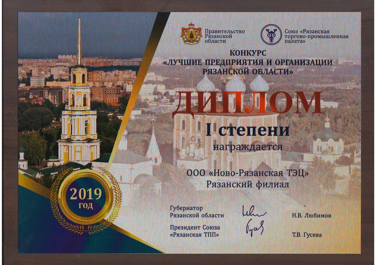 13 декабря в правительстве региона губернатор Николай Любимов наградил дипломом I-ой степени Рязанский филиал ООО «Ново-Рязанская ТЭЦ» по итогам конкурса «Лучшие предприятия и организации Рязанской области» в отраслевой подгруппе за 2018 год. Награду принял генеральный директор ООО «Ново-Рязанская ТЭЦ» Дмитрий Сергеев. Организаторами конкурса с 2010 года выступает правительство области и региональная торгово-промышленная палата. В этом году заявки на участие подали 101 предприятие Рязанской области, а победителями в различных сферах и номинациях были признаны 45 предприятий.